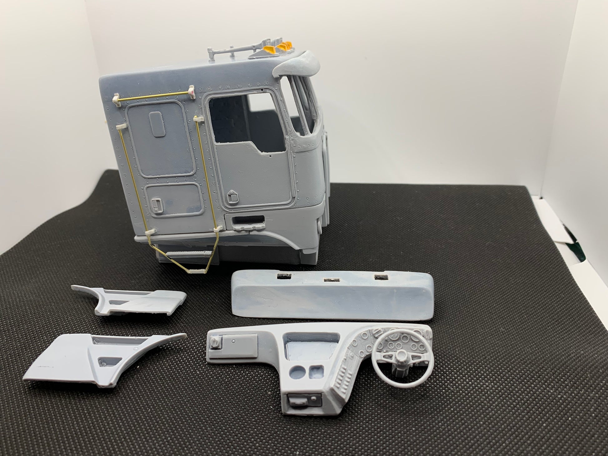 Comes with right hand dash and floor pan, steering wheel and column, standard and drop down sunvisers, steps, hand rails, mirrors, fairing skirts, grill, roof and headlights with bezels and lenses etc, air horns , cab mounts and hinges, Kenworth badges and slam locks and acetate windows.